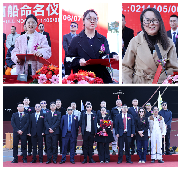 上午9時,命名儀式開始,常務(wù)副總經(jīng)理張玉永主持儀式,總經(jīng)理助理徐震宇與船東MSC代表陳玉坤;圣母劉燕、劉飛、杜潔;ABS船級社代表曹偉等嘉賓齊聚一堂,共同見證這一激動人心的時刻。在熱烈的掌聲中,三位圣母分別來到三艘新船前,宣讀命名詞,祝愿新船“承載夢想,滿載平安,和諧致遠,使命必達!”